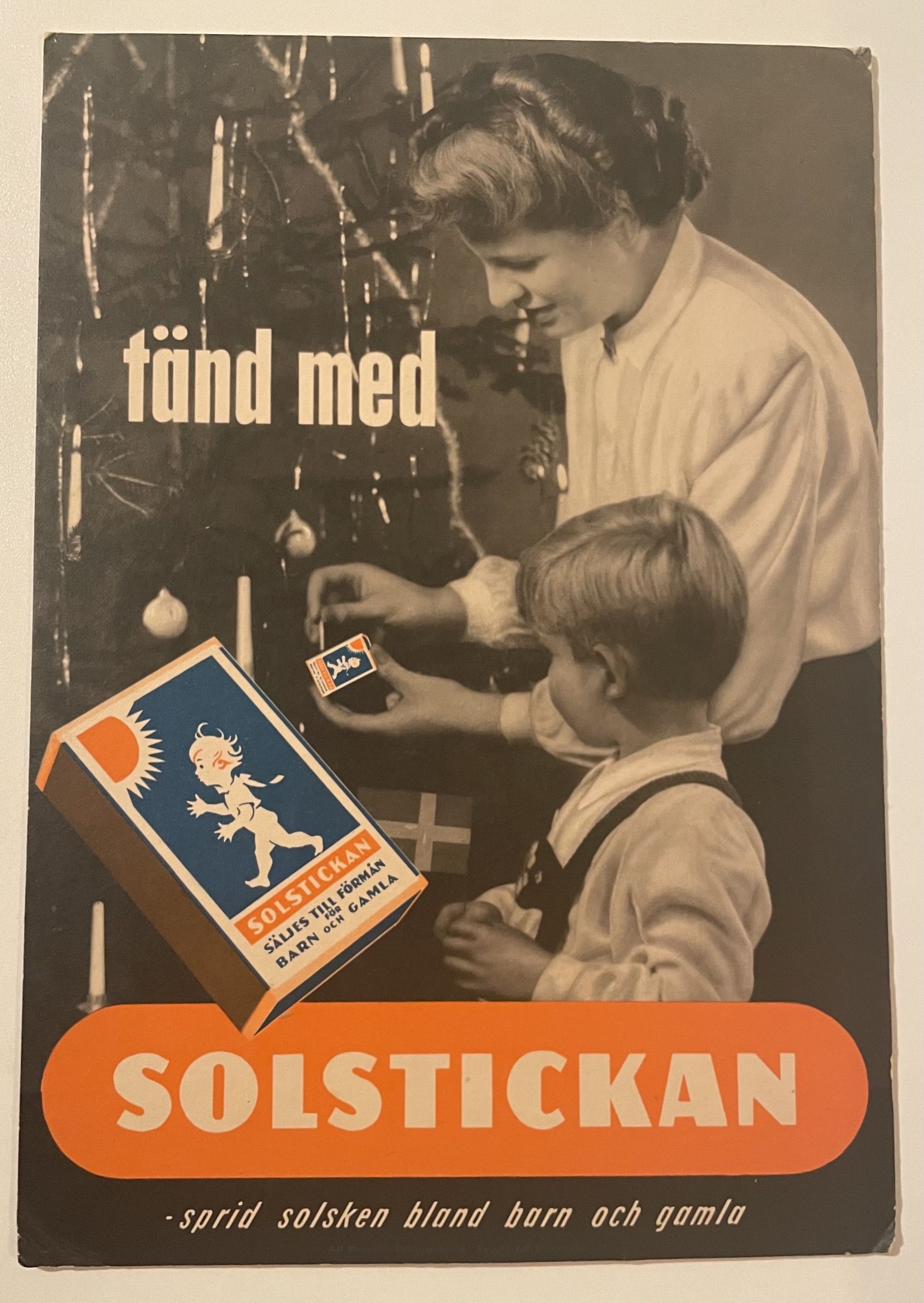 Reklamtryck på kartong, (1945). 34x23,5 cm. Med utfällbar fot på baksidan. Lätt nötta kanter och hörn, mest så i det nedre vänstra hörnet. Affisch för Solstickan ämnad för skyltning i butiksfönster. Svartvitt fotografi föreställande en mor och son tändande julgransbelysningen med Solstickans tändstickor. Tändsticksasken med Einar Nermans klassiska design avbildad i färg två gånger.