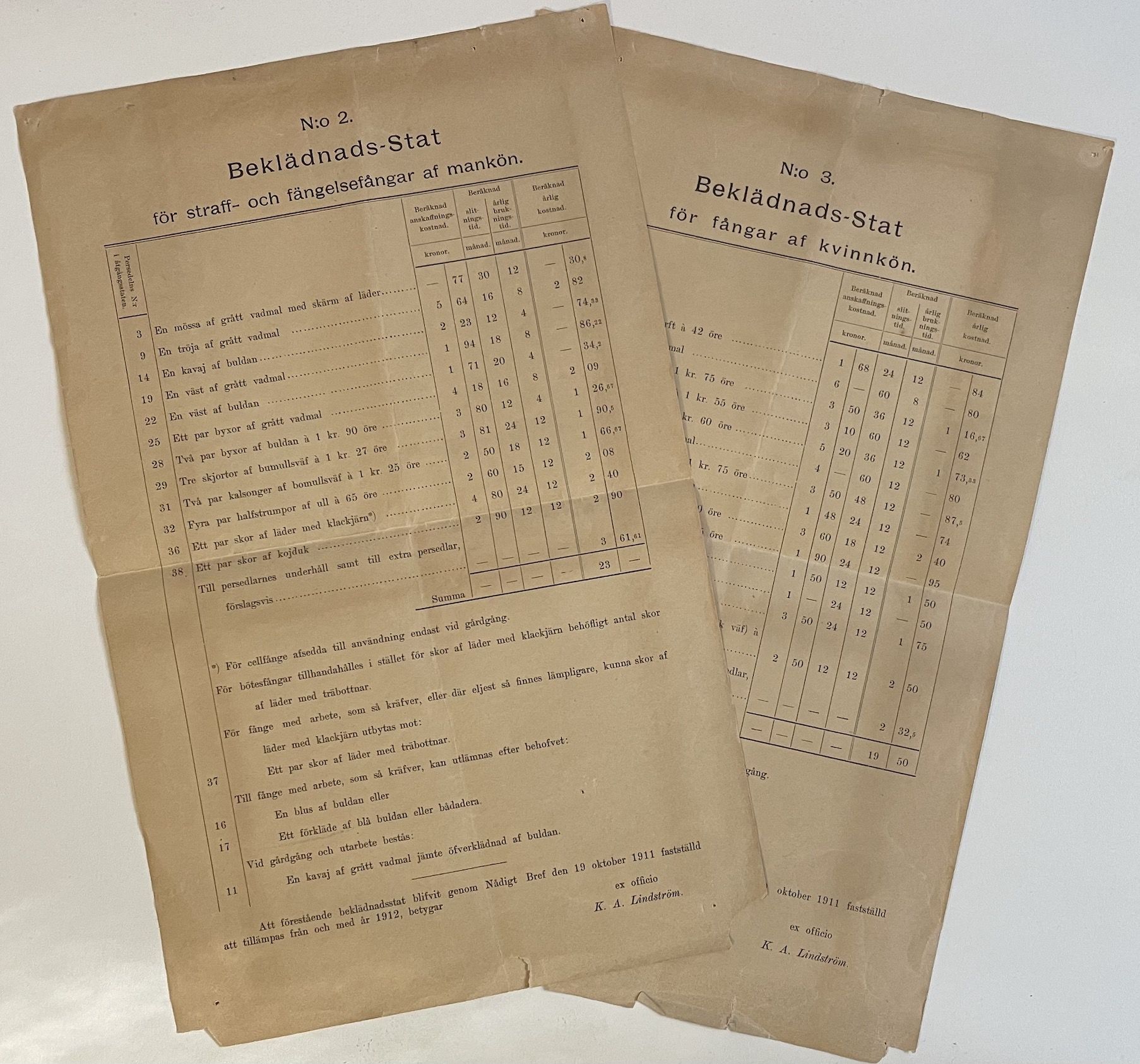 [Fångdräkt] N:o 2. Beklädnads-stat för straff- och fängelsefångar af mankön. + N:o 3. Beklädnads-stat för fångar af kvinnokön.