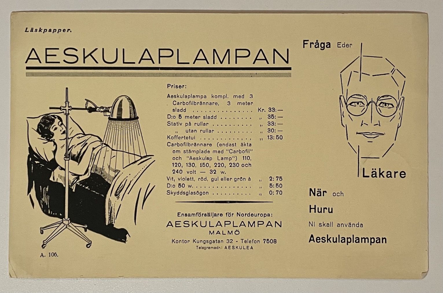 U.o, (ca 1930?). Läskpapper med reklamtryck. 14,5x22,5 cm. Något stötta hörn. Reklamtryckt läskpapper från Aeskulaplampan Malmö.