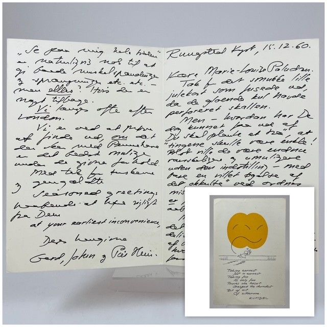 44 linjer med underskrift på dobbeltkort med den engelske version af Piet Heins gruk om at tage spøg for spøg. Dateret Rungsted 15. december 1960. * Lang julehilsen til litteraturkritikeren Marie-Louise Paludan, hvis læsning af bogen "Du skal plante et træ", Piet Hein stiller sig kritisk over for.
